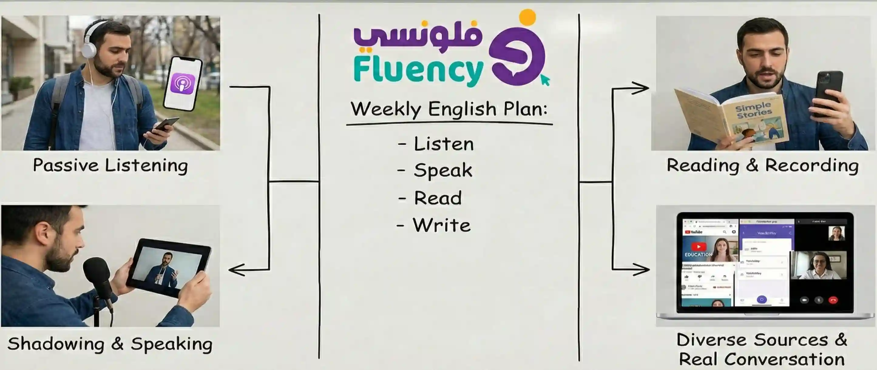 التكامل بين الاستماع والتحدث فعال جدًا: بعد الاستماع لمقطع، قم بتمرين Shadowing ثم اشرح المقطع بكلماتك. هذا يربط الإدراك السمعي بالإنتاج الشفهي ويقلّل الفجوة بين فهم اللغة وقدرتك على استخدامها. مارس هذه التقنية ثلاث مرات أسبوعيًا لنتائج سريعة.