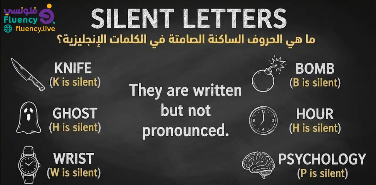 - silent letters هي حروف تُكتب ولا تُنطق مثل k في know و b في dumb و gh في night، ويجب حفظ أنماطها من خلال كلمات شائعة.